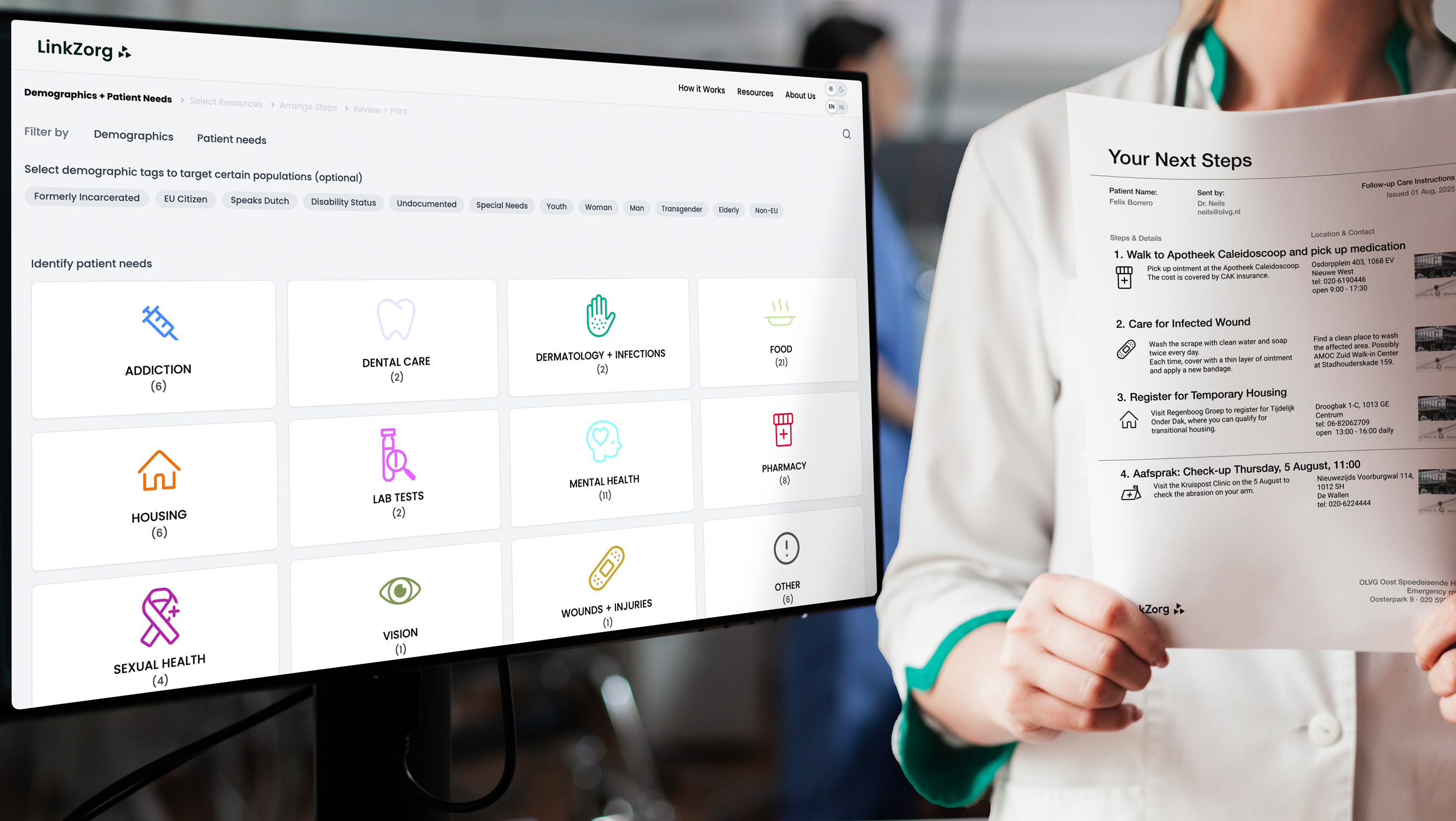 Emergency clinicians at OLVG Oost Hospital in Amsterdam often treat 3U patients—people who are “unhoused, undocumented, or uninsured”—and needed a solution to provide follow-up care and resources. LinkZorg is a simple digital platform that helps ER staff chart an after-care route for their 3U patients as they’re discharged from emergency care.