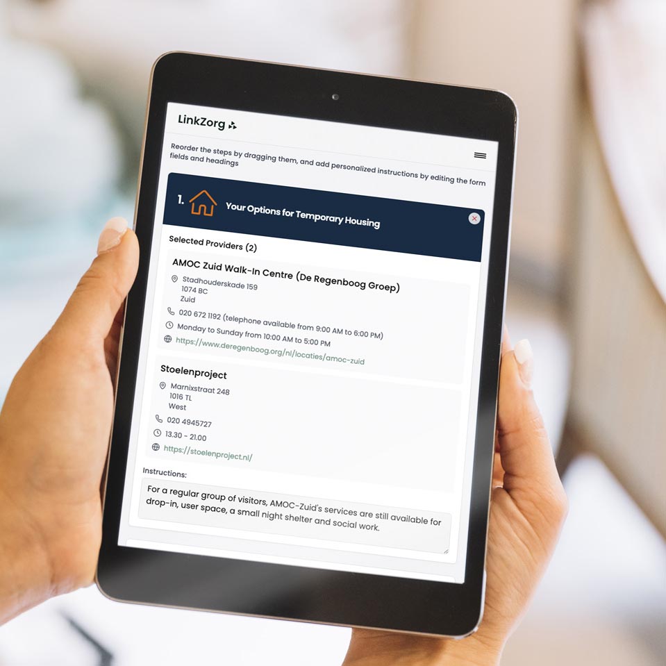 LinkZorg is actively used in OLVG Oost's Emergency Department, where it helps staff provide personalized care plans to vulnerable patients. The project catalyzed new coordination between previously fragmented care providers across Amsterdam, creating the database helped establish a more cohesive network. Hospital staff can now do more for their patients, who leave with information that empowers them to meet their needs beyond crisis recovery.